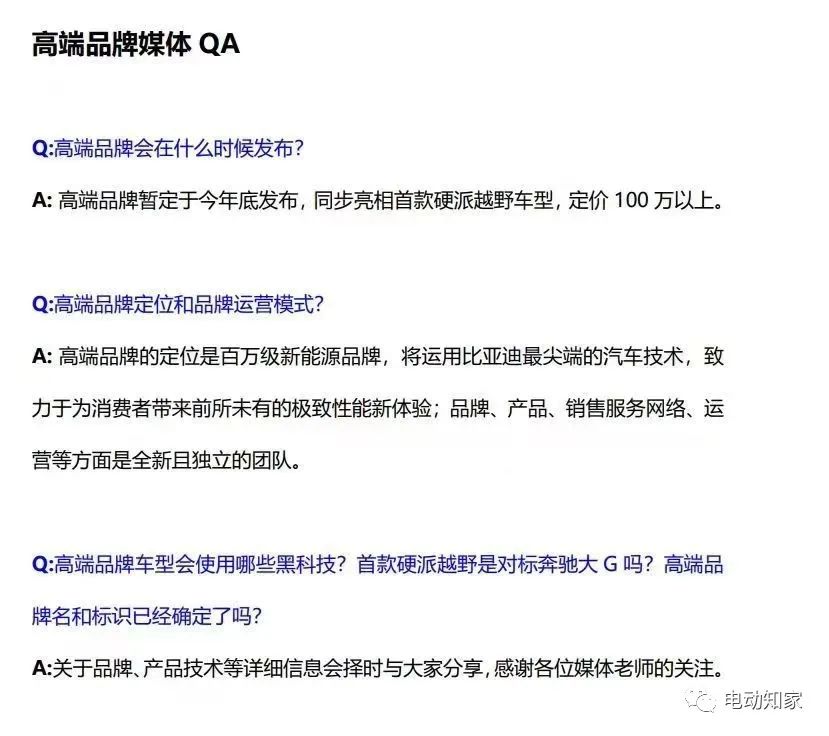 在一张QA记录表里,我们能得到的信息有:比亚迪新高端品牌定位于百万级新能源品牌,将运用比亚迪最尖端的汽车技术;但对于新车是否会选择奔驰G级为竞品,官方没有回答。
