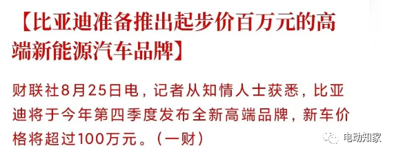 电动知家消息,据媒体报道,比亚迪将于今年第四季度发布全新高端品牌,新车价格将超过100万元。