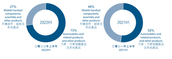 合并后的汽车业务包括制造和销售汽车、汽车相关的模具及零部件、汽车租赁和汽车的售后服务、汽车动力电池、锂离子电池、光伏产品以及铁电池产品、轨道交通及其相关业务及防疫物资产品收入。2022年上半年,汽车业务的营收占比迅速攀升,从去年同期的52%,升至73%,手机部件、组装等业务占比剧烈下滑,从48%下滑至27%。