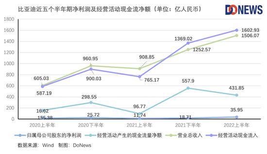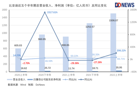 2022年8月29日晚间,比亚迪公布2022年上半年业绩报告,据H股公告报告显示,比亚迪在2022年上半年实现营收1506.07亿元(人民币,下同),同比增长65.71%;毛利203.41亿,同比增长75.35%;归母净利润35.95亿,同比增长206.35%;扣非后归母净利润30.29亿元,同比增长721.72%%;每股盈利1.24元,同比增长202.44%;经营活动现金流净额431.85亿,同比增长346.27%。