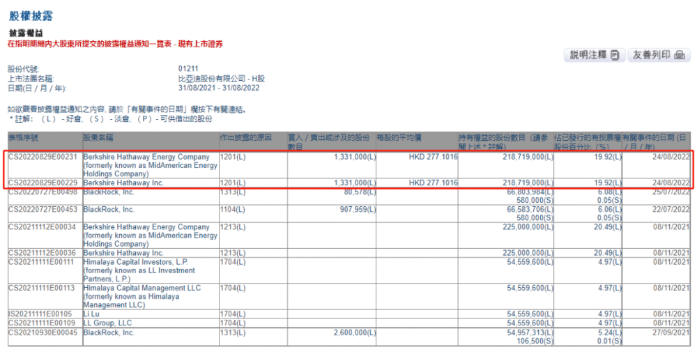 来源:港交所;图注:巴菲特旗下伯克希尔减持133万比亚迪股份
