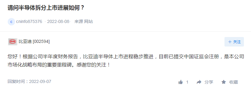 近日,比亚迪半导体再传利好消息,其母公司比亚迪在投资者互动平台表示,比亚迪半导体上市进程稳步推进,目前已提交中国证监会注册,是公司市场化战略布局的重要里程碑。