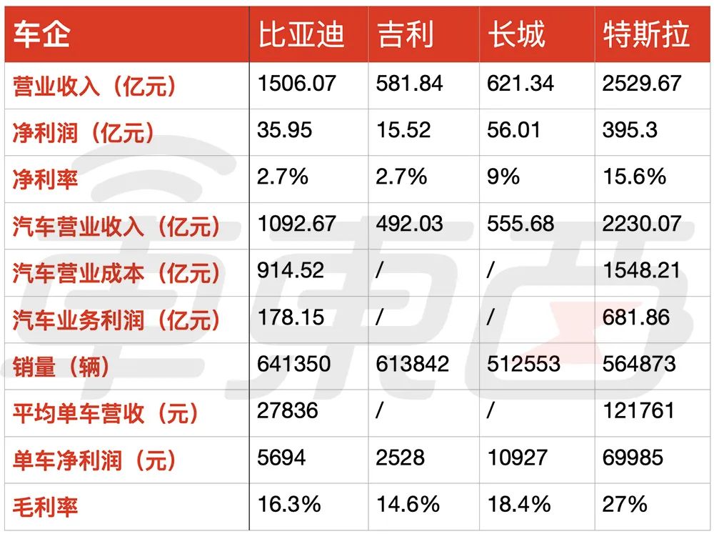 而按照单车净利润=净利润/销量的公式来看,长城汽车的单车净利润为10927元,比亚迪的单车净利润为5694元,而吉利汽车的单车净利润仅为2528元。