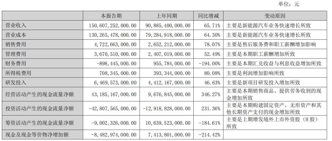 从比亚迪财报中我们也可以看到。今年上半年,比亚迪的营业收入为1506.07亿元,而营业成本为1302.65亿元。