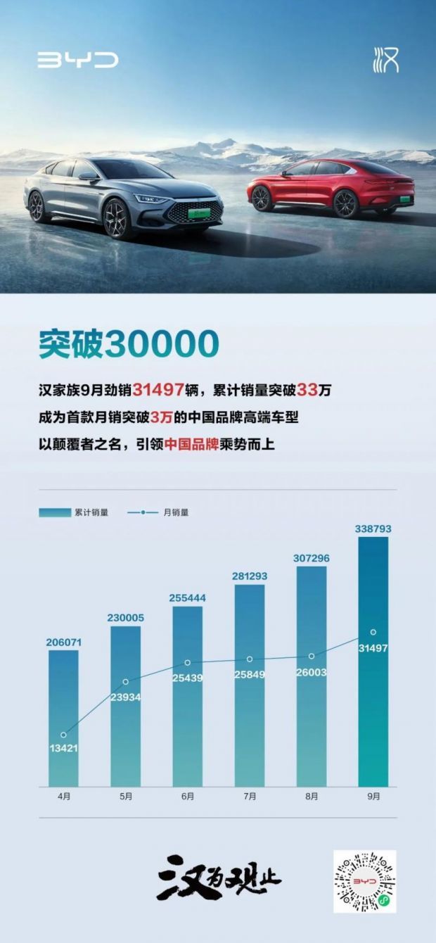 10月4日比亚迪汽车官方公号发布消息称,汉家族9月热销31497辆,成为首款月销突破3万的中国品牌高端车型。