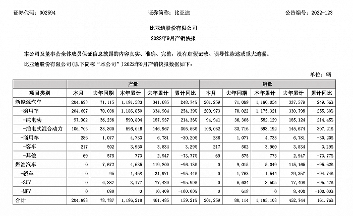 比亚迪10月9日公告,9月新能源汽车销量为201,259辆,本年累计销量为1,180,054辆,累计销量同比增长249.56%。