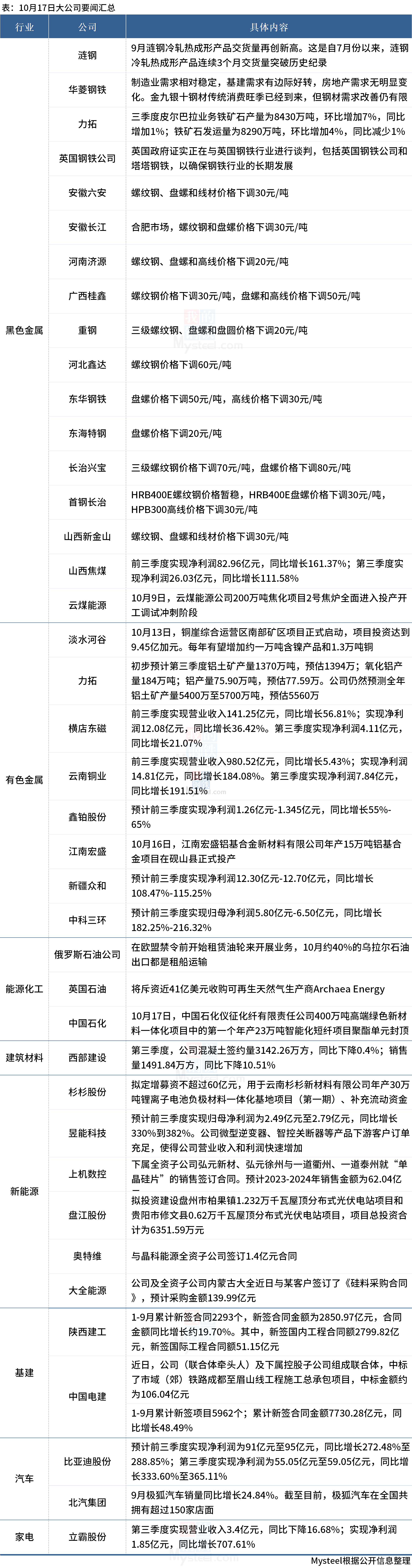 10月18日,Mysteel汇总部分大宗商品相关企业要闻。