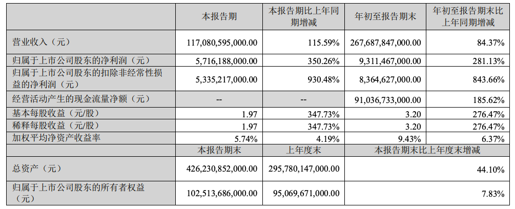 得益于新能源车销量的暴涨,比亚迪业绩表现突出。10月28日晚间,比亚迪发布的2022年第三季度报告显示,比亚迪今年第三季度实现营收约1170.81亿元,同比增长115.59%;归属于上市公司股东的净利润约57.16亿元,同比增长350.26%,创下单季新高。