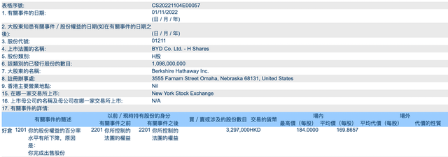 伯克希尔哈撒韦仍持有1.96765亿股比亚迪H股股份,持股比例降至17.92%。