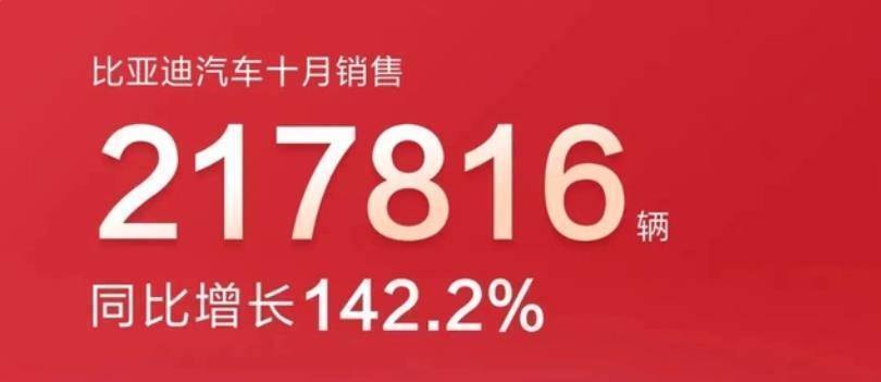既然大家都想看比亚迪的数据,今天我们就来盘点一下它十月的销量情况。尽管大环境不太友好,但还是延续了9月份的强势,单月销量又超过了20万,达到了217816辆(含出口9529辆),同比增长142.2%。