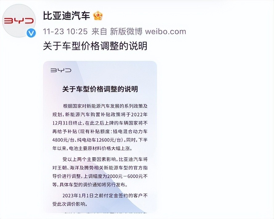 11月23日,比亚迪汽车突然宣布:2023年1月1日起将王朝、海洋及腾势相关新能源车型的售价上涨2000-6000元不等。