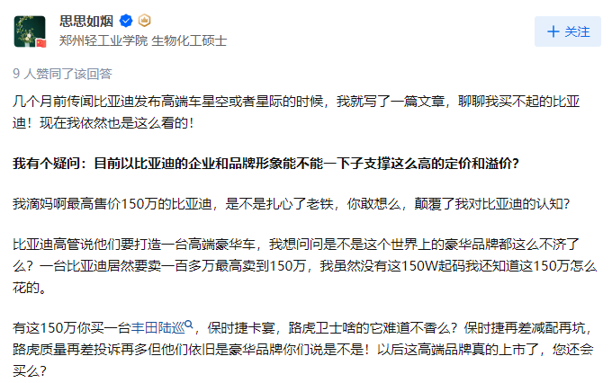 即使大家内心愿意支持国产品牌,但对比亚迪的品牌形象能不能支撑一款百万价格的豪车,社会大众还是心里还是打鼓的,上面知乎网友思思如烟的态度,就非常有代表性。