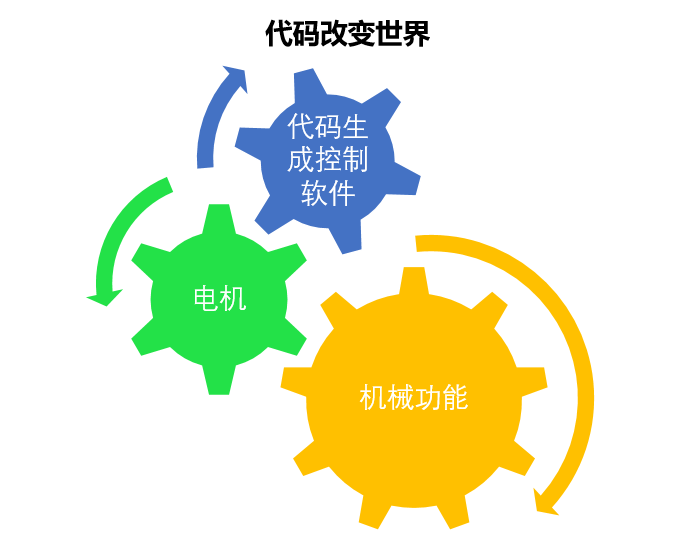 具体的操作思路是用代码生成控制软件,通过操作电机驱动机械来实现各种机械功能。这样就将复杂的机械功能转换变成几行代码的写作,难度下降了N个数量级。代码与机械功能之间通过电机连接。因为电机可以用非常小的误差实现机械功能,以我们常用的17位伺服电机为例,用脉冲来控制电机运动,每131072个脉冲转一圈,也就是最小精度是360/131072=0.0027度,定位误差可以达到0.001毫米。