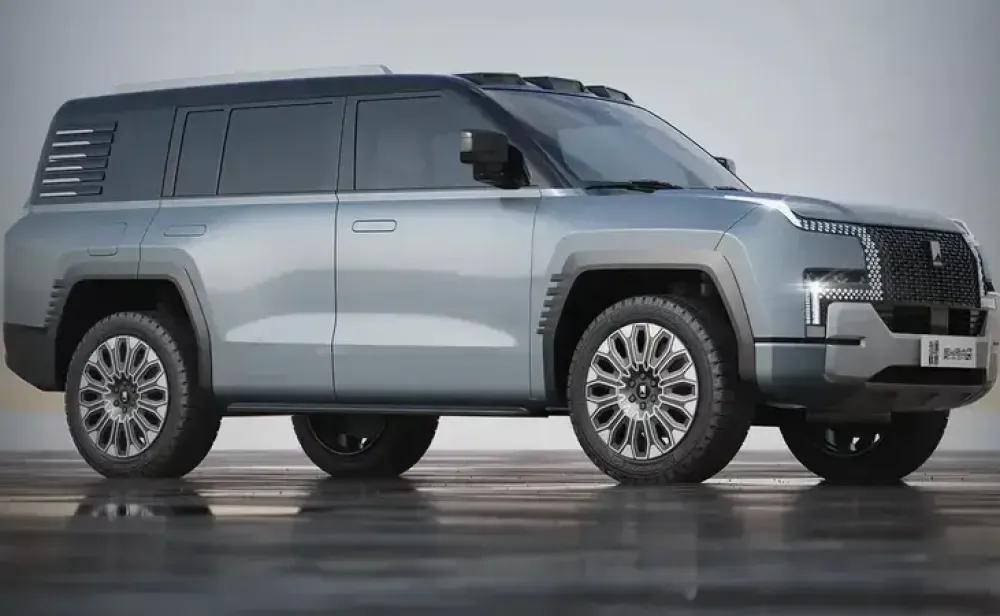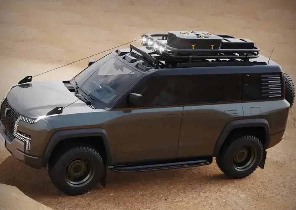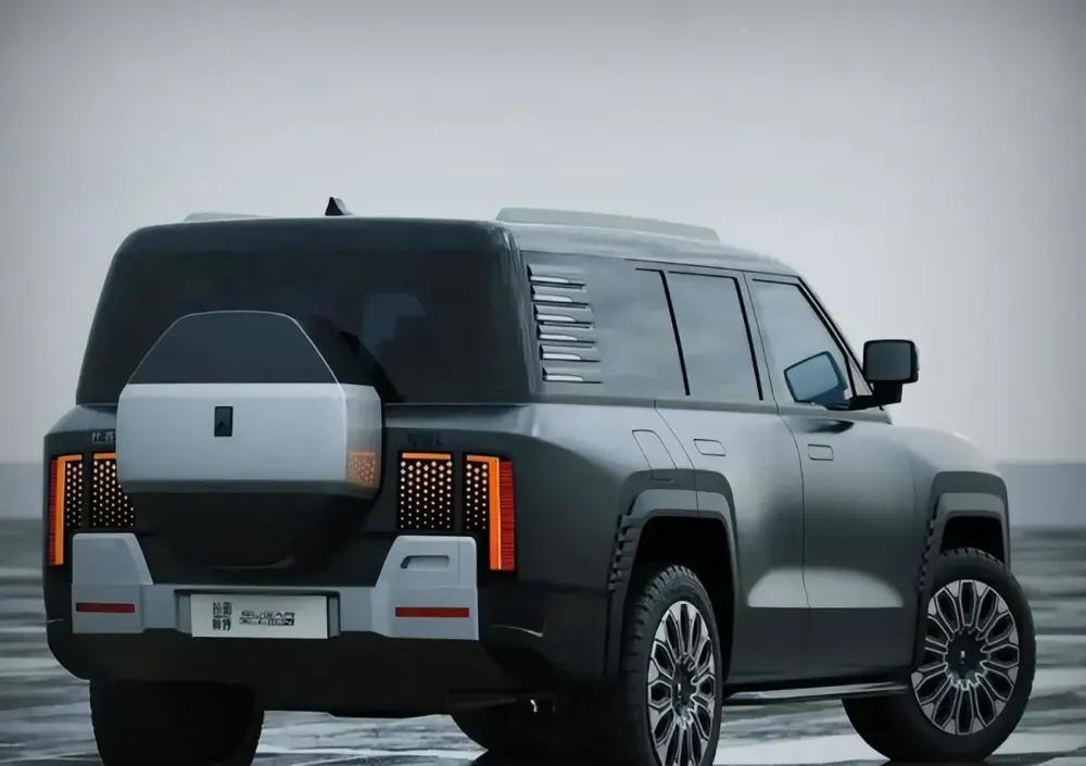 来到侧面,这款车带来了一种路虎卫士的感觉,但很明显比后者要丰富太多了,新车同样没有设计传统的腰线,但前后双层的直立式轮眉则将它的力量感毫无保留的凸显出来!为了能让它的整体性得到延伸,包括车门把手已经换成了隐藏式的布局,仅在这下半部分,这款“仰光R1”已经足以碾压路虎卫士。而且我们还注意到整个D柱处理也能彰显出设计功底!到了车尾,熟悉的外挂式备胎出现在了这款车上,而且首次在外壳上还加入了撞色处理。尾部上的小扳手与车头正好形成呼应!线阵式的尾灯也会让整部车营造出一种你那个梦幻感!