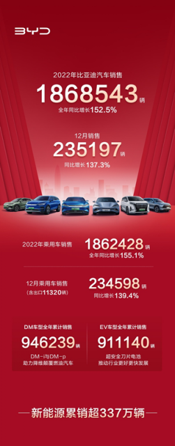 根据比亚迪官方公布的数据显示,比亚迪2022年12月汽车销量为23.52万辆,同比增长137.3%;2022年全年累计销量186.35万辆,同比增长208.64%。其中,DM混动车型全年累计销量94.62万辆,EV纯电车型累计销量91.11万辆。