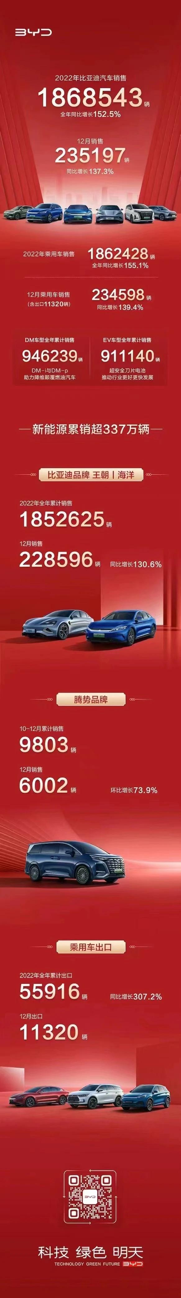 1月2日,比亚迪官方公布了今年12月的销量数据。比亚迪12月销量,同比增长137.3%,创下了比亚迪单月销量最高纪录。除此之外,比亚迪的全年销量才是一个惊喜。在整个2022年,比亚迪全年累计销量达到了186.9万辆,同比增长152.5%。