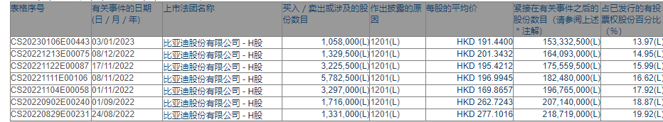 1月9日,港交所文件显示,伯克希尔哈撒韦于1月3日出售了约105.8万股比亚迪H股,持股比例降至13.97%。