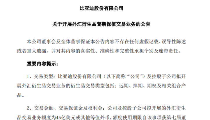 日前,新能源汽车行业领军企业比亚迪表示,公司及控股子公司拟在2023年度开展外汇衍生品套期保值交易业务,外汇衍生品交易业务额度高达45亿美元。从目前来看,其外汇套保额度遥遥领先其他进行外汇套保的上市公司。