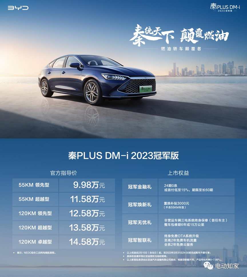 比亚迪又放大招了。电动知家消息,2月10日,比亚迪秦PLUS DM-i冠军版正式上市,官方指导价为9.98万元-14.58万元,DM-i车型价格首次下探至10万以内。秦PLUS DM-i冠军版还对配置进行升级,继续搭载1.5L插电混动系统,百公里亏电油耗3.8L,综合续航里程达到1245km。作为“燃油轿车颠覆者”,秦PLUS DM-i 2023冠军版携五大颠覆、四大焕新,正式开启“油电同价”新时代,加速新能源绿色出行方式变革,将颠覆燃油进行到底!