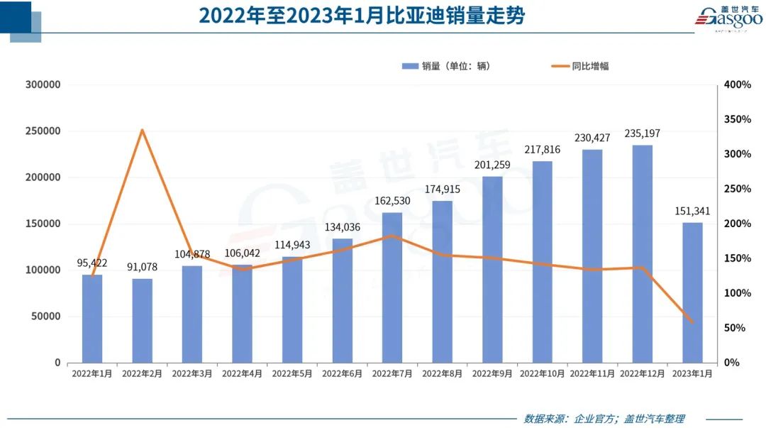 1月,比亚迪共销售151,341辆新能源汽车,环比虽下滑35.65%,但同比仍增长了58.6%。无论是数量还是增幅上,都绝对碾压新势力车企。