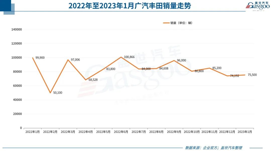 事实上,广汽丰田在2022年的表现就相对突出,在一众合资品牌销量下滑或大幅震荡的情况下稳健增长。这一年广汽丰田累计销售汽车约100.5万辆,同比增长21.4%,在日系品牌连续三年呈下降趋势的状态下,广汽丰田成为2022年极其少有的、达成百万产销的合资主流车企。