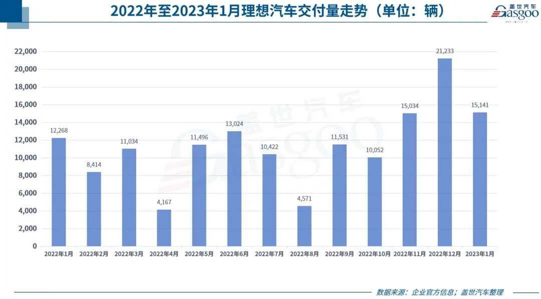 蔚来表现相对稳健,但与理想差距明显。事实上,1月造车新势力中,仅有理想交付破万,呈现同比正增长。该月理想共计交付新车15,141辆,虽未继续维持在2万+的水平,但这一成绩仍可谓优秀。