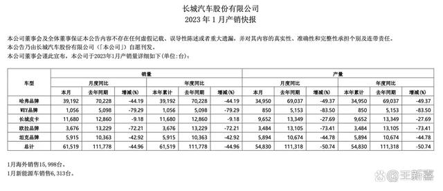 从SUV销量总量来看,与比亚迪的差距越来越大,且长安与吉利也已经呈现超越之势,SUV又是长城的核心腹地与大本营,毕竟,别的车企还有轿车,长城只有SUV,根据长城产销快报,2023年1月,整个哈弗品牌下跌了44%,可以说长城越来越危险了。长城SUV走到今天的局面,要反思的地方太多,留给长城调整的时间不多了。