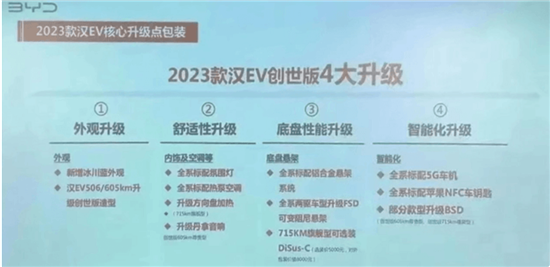 关于比亚迪汉2023款即将上市的信息,比亚迪北京王朝门店销售人员表示,预计3-4月上市。根据网络曝光的配置升级信息,预计比亚迪将针对2022款创世版和老款汉EV 506km和605km续航版车型在外观、舒适性、底盘性能以及智能化4方面进行升级,售价有望23万元起。
