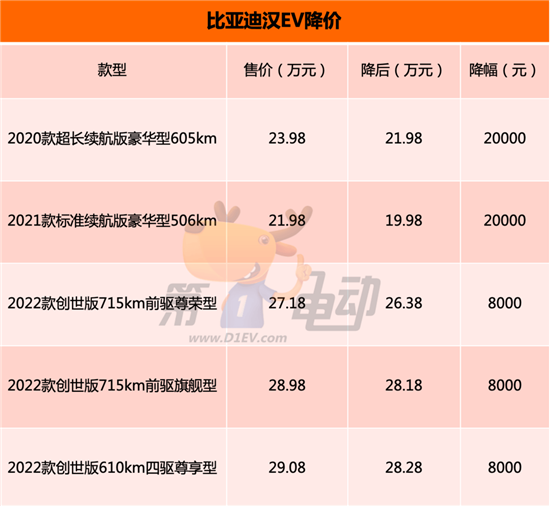 据比亚迪北京王朝门店销售人员介绍,为了老款清库存,2020款超长续航版605km(官方指导价23.98万)和2021款标续版506km(官方指导价21.98万)售价直降2万元。此外,如果是比亚迪燃油车置换电动车的话另外再补贴8000元(2022年前补贴1万元)。叠加起来的话,比亚迪汉现在的最低价为19.18万元,售价创历史新低。
