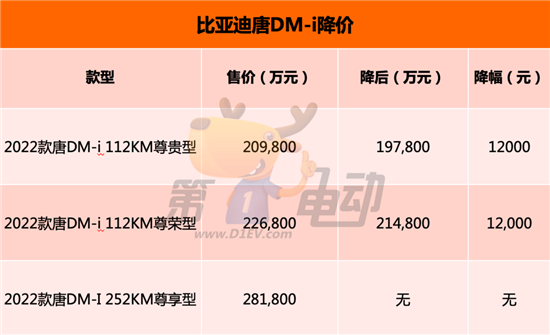 近日,第一电动从比亚迪王朝门店获悉,老款唐DM-i、汉EV均大幅降价,2022款唐DM-i最低起售价19.87万元,2021款汉EV最低起售价19.98万元。这是比亚迪王朝双旗舰车型首次共同下探到20万元以内。