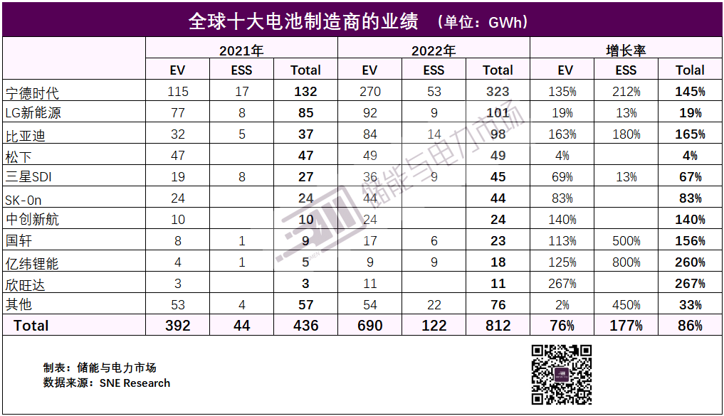 2022年,中国的动力电池和储能电池需求均实现了快速增长,助推了中国电池制造商的良好业绩表现。与之相比,海外电池厂商LG新能源(LG Energy Solution)和松下的增长率分别只有19%和4%,与86%的整体市场增长率存在巨大差距。
