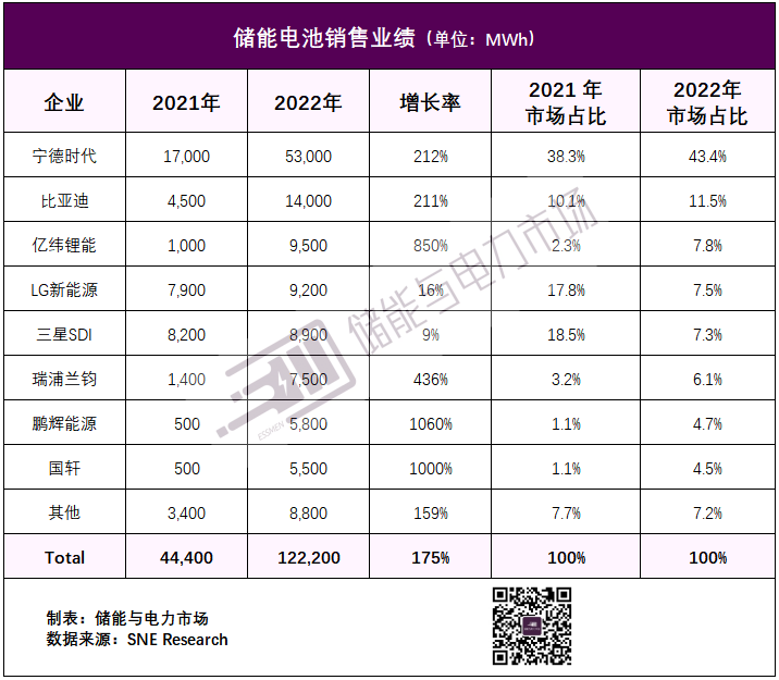 2022年,宁德时代、比亚迪、亿纬锂能锁定全球储能电池市场的前三把交椅。储能电池销量超过5GWh的中国电池企业还有瑞浦兰钧、鹏辉、国轩高科。