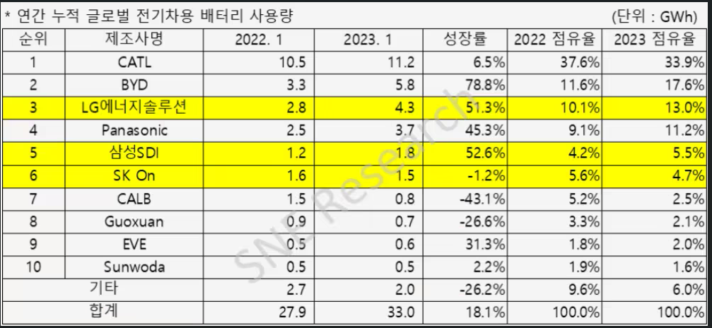 在韩国市场研究机构SNE research近日发布的2023年1月的全球动力电池装车数据显示,比亚迪电池装车量排名第二位,1月电池装车量达到了5.8GWh,同比大幅增长78.8%,增长幅度在前十位中排在第一。同时,市场份额也从去年同期的11.6%增长6%至17.6%,与宁德时代进一步缩小差距。