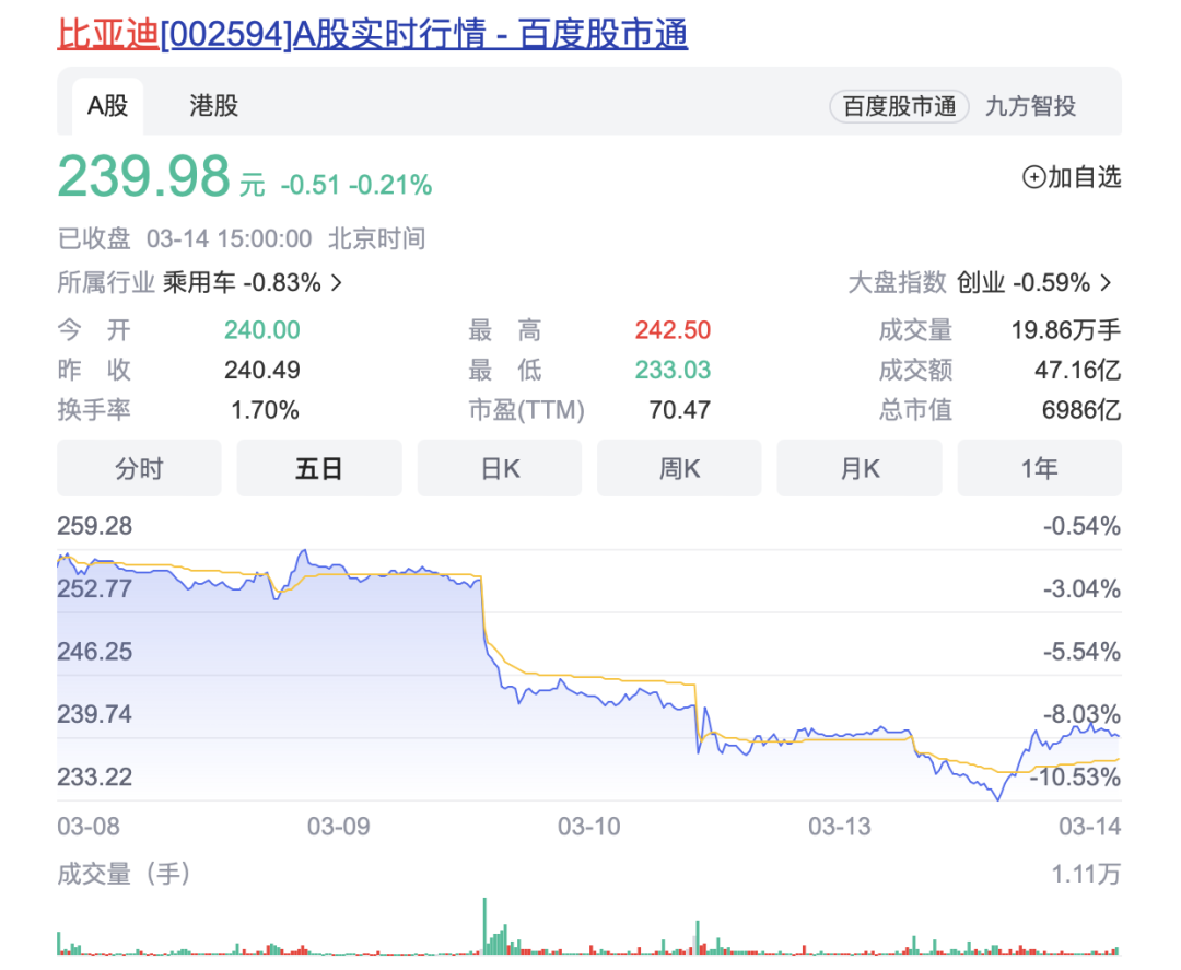 不过即使特斯拉和比亚迪都双双否认了韩媒的报道,但所谓无风不起浪,消息可能并非空穴来风。另外也可以看出,对于股市的号召力方面,特斯拉远胜过比亚迪。受到种种不利影响,3月14日,比亚迪A股股价一度跌超3%,午后曾一度翻红,但是尾盘微跌,报239.98元/股,总市值约6986亿元。