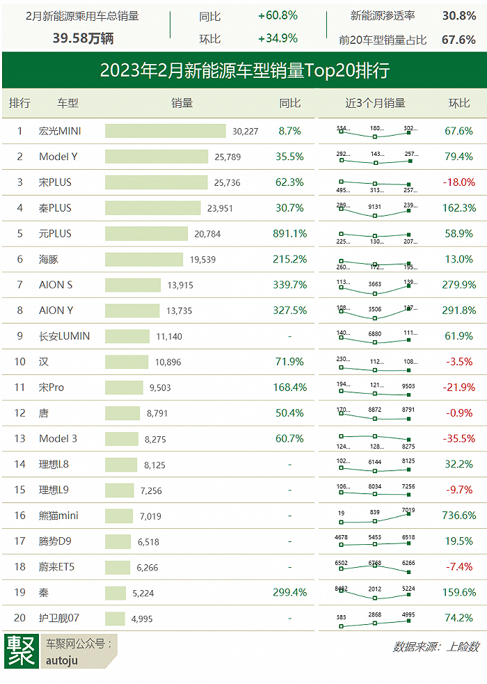 再看看车型榜。时隔三个月后,宏光MINI EV今年2月以3.02万辆的成绩重回冠军。看来,“老将”实力仍存,同时也说明车还是便宜的好卖。3万多的起售价,用车成本也低,挂绿牌,满足日常用车……选它,何乐而不为!