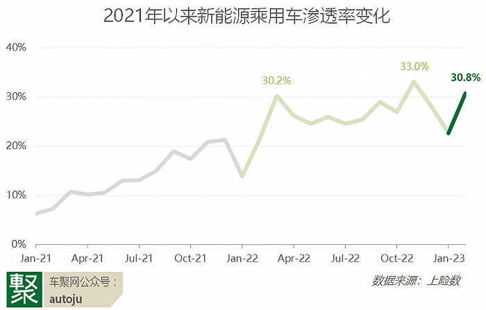 在当期乘用车中,新能源车2月渗透率达30.8%,这是历史第三次突破30%,也是历史第二高——仅次于2022年11月的33.0%。