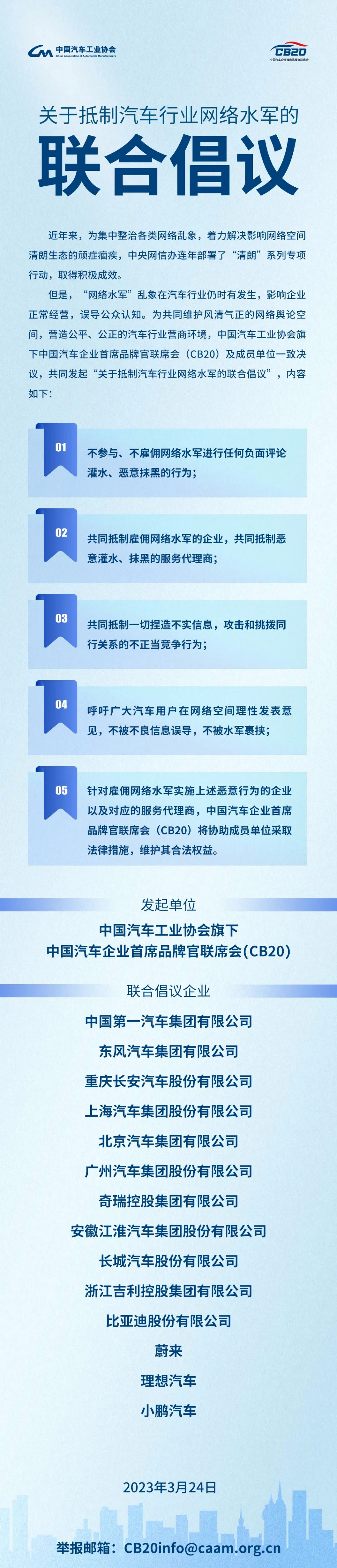 3月24日,《每日经济新闻》记者从中国汽车工业协会(以下简称中汽协)方面了解到,为共同维护风清气正的网络舆论空间,营造公平、公正的汽车行业营商环境,中汽协旗下中国汽车企业首席品牌官联席会(CB20)及成员单位一致决议发起了“关于抵制汽车行业网络水军的联合倡议”。
