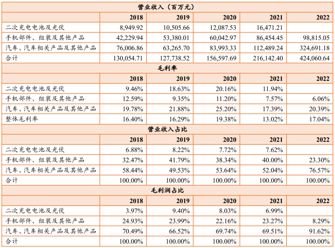接着我们看看业务结构。2022年比亚迪对收入进行了调整,二次充电电池及光伏业务没有单独列出来了,而是跟汽车相关业务进行了合并,该板块收入为3247亿元,同比增长151.78%,占收入比重提升到76.57%,毛利占比达到91.62%。总的来讲,基本成为了一家汽车企业,消费电子组装业务虽然有所增长,但是占比萎缩很快。