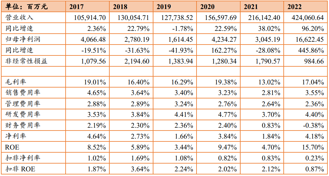 2022年比亚迪收入为4240.61亿元,同比增长96.2%,归母净利润166.23亿元,同比增长445.86%,毛利率为17.04%,较2021年提升4.02pct,净利率为4.18%,较2021年提升2.34pct。