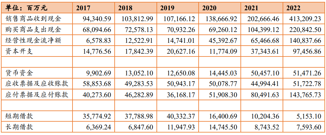 比亚迪的现金流情况很好,毕竟车企是对C端销售,而对于供应商又有足够的议价权,比亚迪2022年应收是517亿,大概是应收的八分之一,而应付账款达到了1438亿元,大概是营业成本的四成。