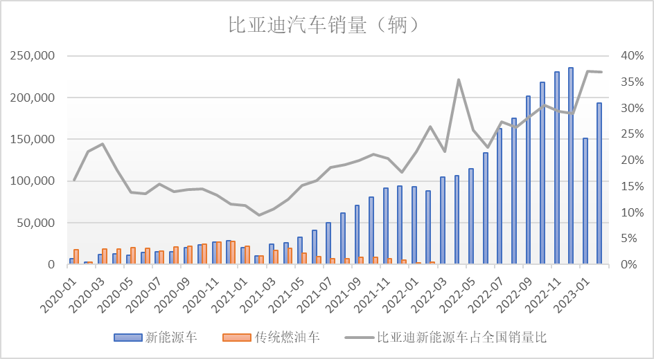 在看业绩数据之前,先看看比亚迪汽车销售数据,2022年,公司汽车产量为188.17万辆,同比增长151.71%,销量为186.85万辆,同比增长152.46%;而2022年全年我国汽车产量、销量分别为2,702.10万、2,686.40万,比亚迪份额分别在7%左右,2022年我国新能源汽车产量、销量分别为705.80万、688.70万,比亚迪份额分别为26.59%、27.06%。