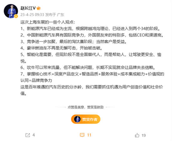 不得不说,赵长江总结的这7点确实很有道理,也很有指导意义,对于车企负责人来讲同样有参考价值,还有网友补充称:需要加一点,就是大型车企集团放弃幻想,开始规模降本竞争。