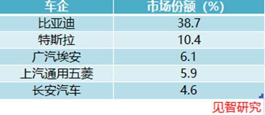 第三名是广汽埃安,市占率6.1%;第四名是上汽通用五菱,市占率5.9%;第五名是长安汽车,市占率4.6%。