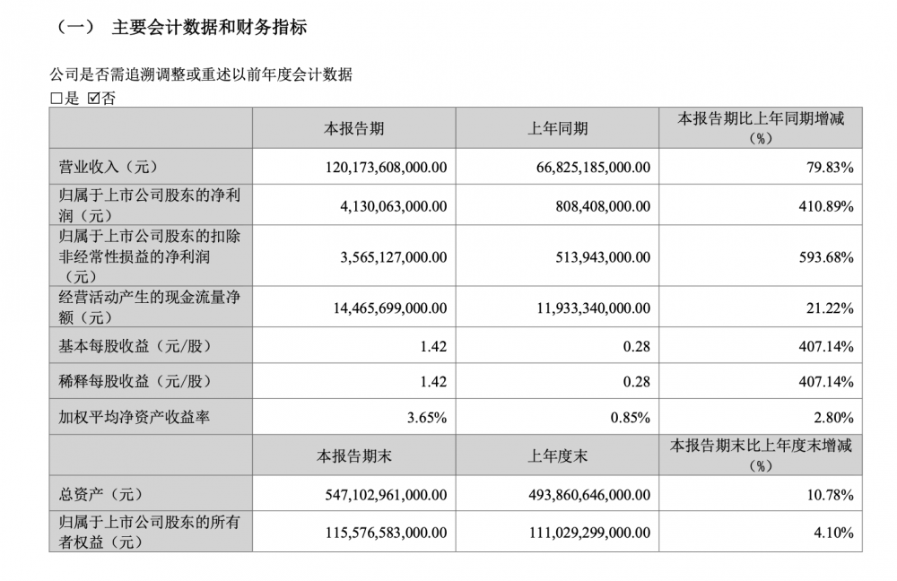 财报显示,比亚迪一季度实现营业收入1201.73亿元,同比增长79.83%;实现净利润41.3亿元,同比增长410.89%。