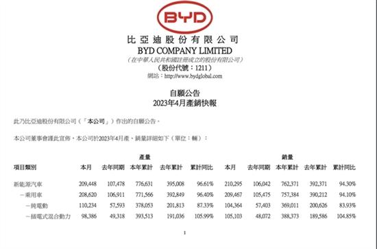 快科技5月4日消息,近日,比亚迪汽车发布了2023年4月份的品牌销量数据,共卖出了210295辆,其中乘用车销量达到了209467辆,同比增长98.6%。