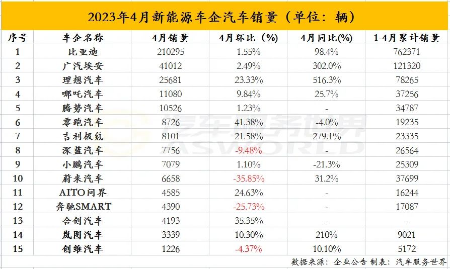 表格中统计车企4月新能源汽车销量,呈现出几个比较明显的特点。