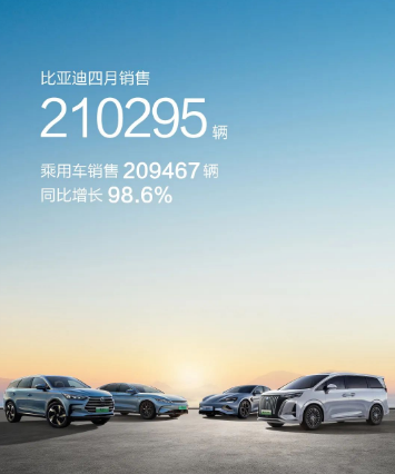 据统计,4月份比亚迪共销售新车21.03万辆,同比增长98.3%,产量为20.94万辆,同比增长96.61%。今年一季度累计销量达到44.08万辆,超越大众成为当季中国汽车市场的销量冠军。与此同时,比亚迪今年一季度的营收达到了1201.74 亿元,净利润同比增长410.89%至41.3亿元。