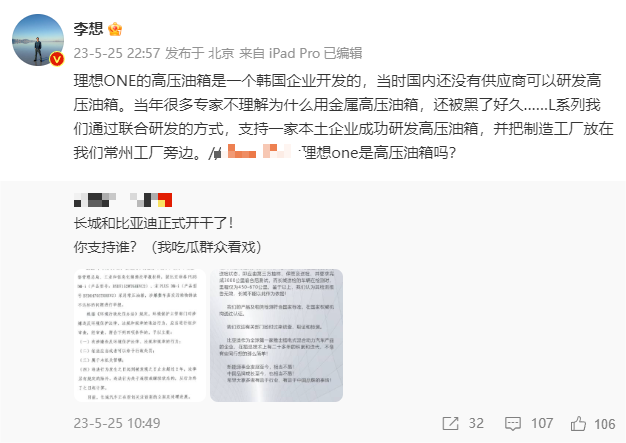 李想回答称,理想ONE的高压油箱是由一个韩国企业开发,当时国内尚未有供应商可以研发高压油箱。并且当年很多专家不理解为什么使用金属高压油箱,李想还表示理想汽车更是因此被黑很久。