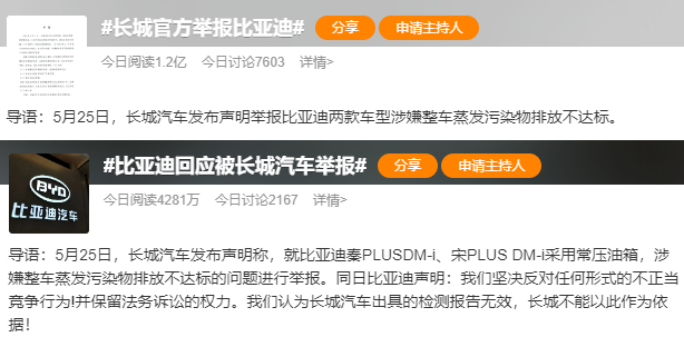 5月25日,长城汽车就比亚迪两款插电混动车型采用常压油箱,涉嫌整车蒸发污染物排放不达标的问题进行举报,引起广泛关注。