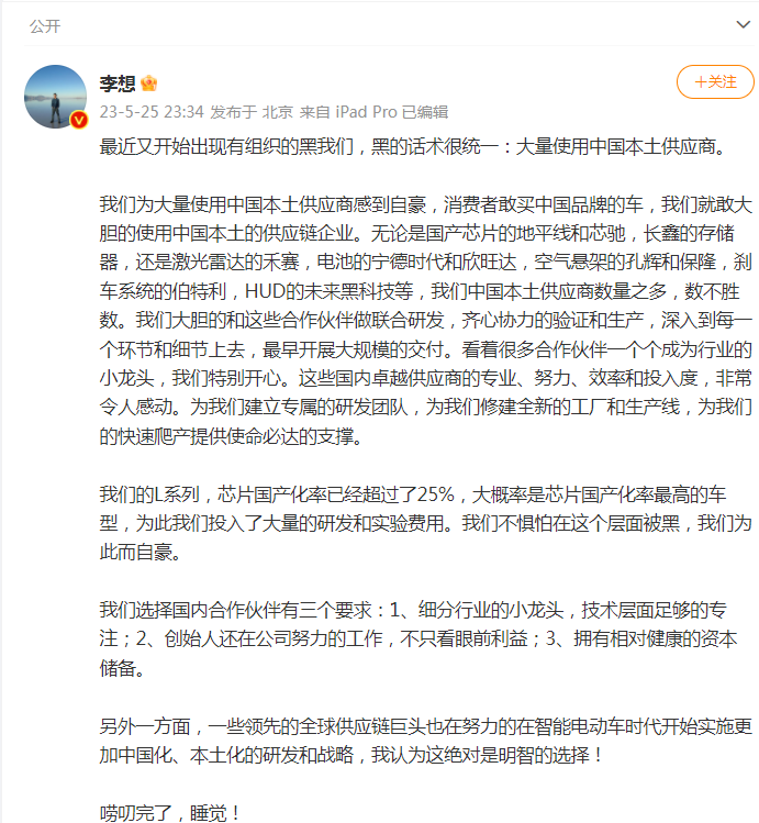 李想表示,最近又开始出现有组织的黑我们,黑的话术很统一:大量使用中国本土供应商。